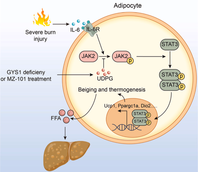 綜上,該研究首次系統(tǒng)闡明了GYS1-UDPG-JAK2-STAT3信號軸在燒傷后病理性白色脂肪組織褐變中的核心調控作用,并創(chuàng)新性地提出靶向抑制GYS1可作為治療燒傷誘導的高代謝狀態(tài)的新型治療策略。這一發(fā)現(xiàn)不僅深化了人們對燒傷后代謝紊亂機制的理解,也為臨床干預提供了新的潛在治療靶點。